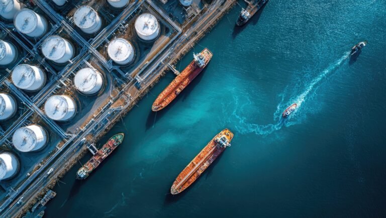 Aerial view of a busy port with large oil tankers and storage tanks